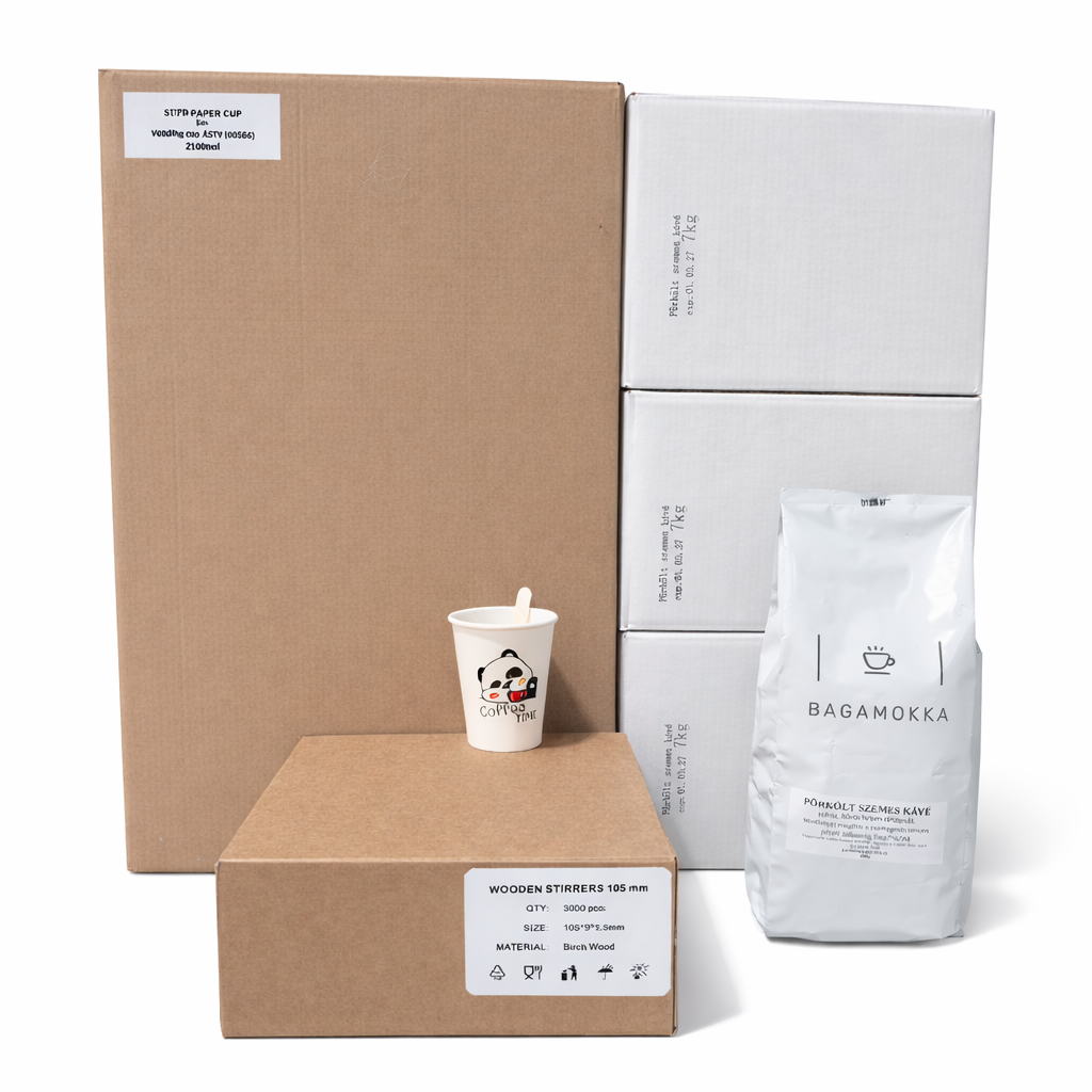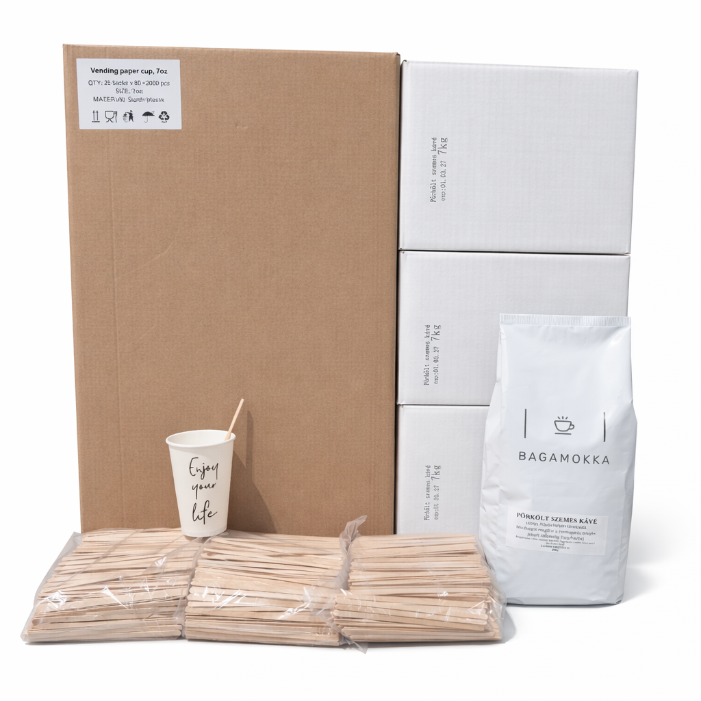 21 kg Szemes Kávé +2500db 6oz papírpohár+3000db keverő csomag akció